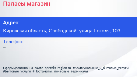 Паласы, магазин по адресу Кировская область, Слободской, улица Гоголя, 103 в дальнейшем Организация, размещена в следующих категориях: