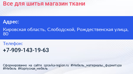 Все для шитья, магазин ткани по адресу Кировская область, Слободской, Рождественская улица, 80 в дальнейшем Организация, размещена в следующих категориях: