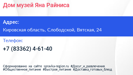 Дом-музей Яна Райниса по адресу Кировская область, Слободской, Вятская, 24 в дальнейшем Организация, размещена в следующих категориях: