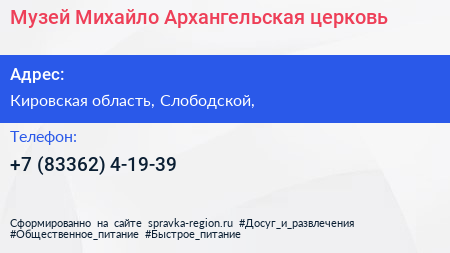 Музей Михайло-Архангельская церковь по адресу Кировская область, Слободской, в дальнейшем Организация, размещена в следующих категориях: