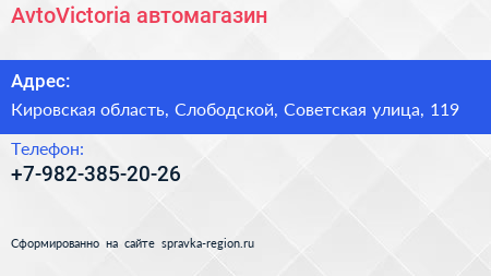 AvtoVictoria, автомагазин по адресу Кировская область, Слободской, Советская улица, 119 в дальнейшем Организация, размещена в следующих категориях: