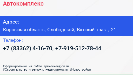 Автокомплекс по адресу Кировская область, Слободской, Вятский тракт, 21 в дальнейшем Организация, размещена в следующих категориях:
