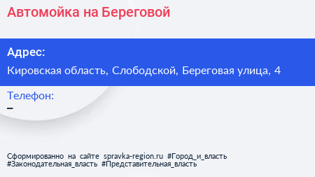 Автомойка на Береговой по адресу Кировская область, Слободской, Береговая улица, 4 в дальнейшем Организация, размещена в следующих категориях: