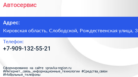 Автосервис по адресу Кировская область, Слободской, Рождественская улица, 3 в дальнейшем Организация, размещена в следующих категориях: