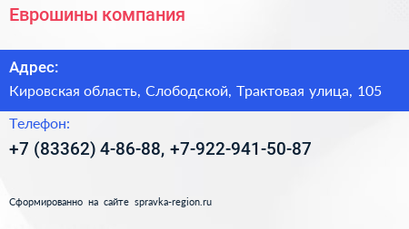 Еврошины, компания по адресу Кировская область, Слободской, Трактовая улица, 105 в дальнейшем Организация, размещена в следующих категориях: