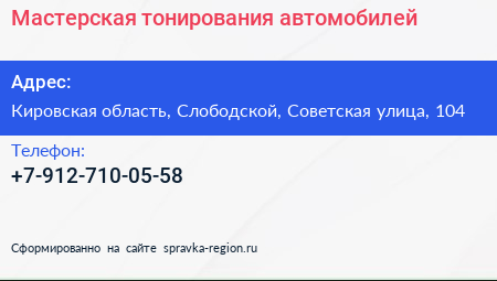 Мастерская тонирования автомобилей по адресу Кировская область, Слободской, Советская улица, 104 в дальнейшем Организация, размещена в следующих категориях:
