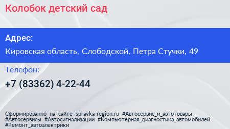 Колобок, детский сад по адресу Кировская область, Слободской, Петра Стучки, 49 в дальнейшем Организация, размещена в следующих категориях: