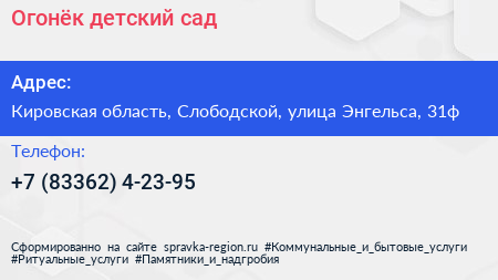 Огонёк, детский сад по адресу Кировская область, Слободской, улица Энгельса, 31ф в дальнейшем Организация, размещена в следующих категориях: