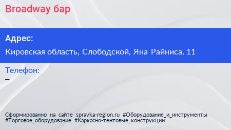 Broadway, бар по адресу Кировская область, Слободской, Яна Райниса, 11 в дальнейшем Организация, размещена в следующих категориях: