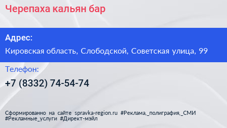 Черепаха, кальян-бар по адресу Кировская область, Слободской, Советская улица, 99 в дальнейшем Организация, размещена в следующих категориях: