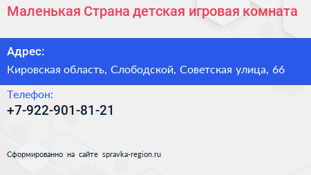 Маленькая Страна, детская игровая комната по адресу Кировская область, Слободской, Советская улица, 66 в дальнейшем Организация, размещена в следующих категориях: