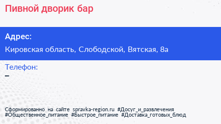 Пивной дворик, бар по адресу Кировская область, Слободской, Вятская, 8а в дальнейшем Организация, размещена в следующих категориях: