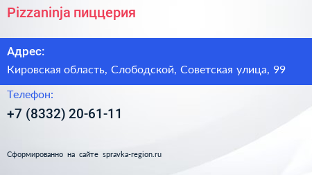 Pizzaninja, пиццерия по адресу Кировская область, Слободской, Советская улица, 99 в дальнейшем Организация, размещена в следующих категориях: