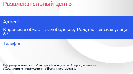 Развлекательный центр по адресу Кировская область, Слободской, Рождественская улица, 67 в дальнейшем Организация, размещена в следующих категориях: