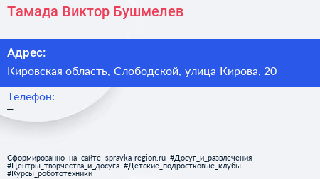 Тамада Виктор Бушмелев по адресу Кировская область, Слободской, улица Кирова, 20 в дальнейшем Организация, размещена в следующих категориях: