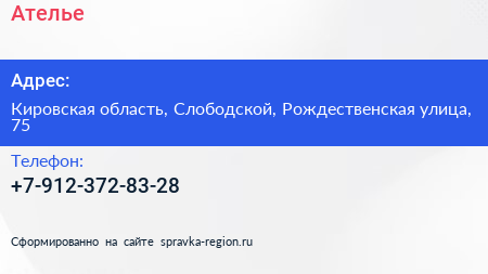 Ателье по адресу Кировская область, Слободской, Рождественская улица, 75 в дальнейшем Организация, размещена в следующих категориях:
