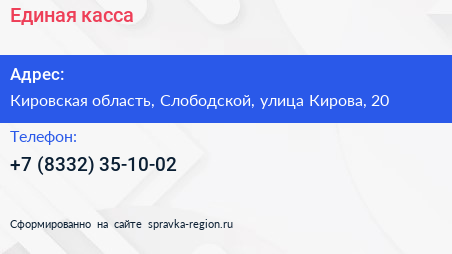 Единая касса по адресу Кировская область, Слободской, улица Кирова, 20 в дальнейшем Организация, размещена в следующих категориях: