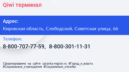 Qiwi, терминал по адресу Кировская область, Слободской, Советская улица, 66 в дальнейшем Организация, размещена в следующих категориях: