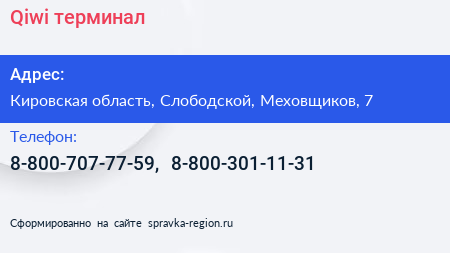 Qiwi, терминал по адресу Кировская область, Слободской, Меховщиков, 7 в дальнейшем Организация, размещена в следующих категориях: