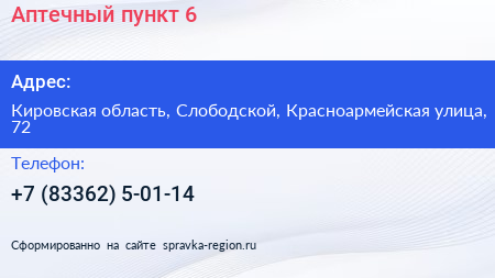 Аптечный пункт №6 по адресу Кировская область, Слободской, Красноармейская улица, 72 в дальнейшем Организация, размещена в следующих категориях:
