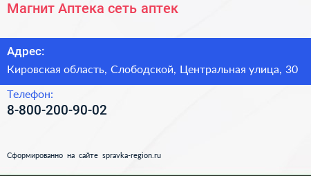 Магнит Аптека, сеть аптек по адресу Кировская область, Слободской, Центральная улица, 30 в дальнейшем Организация, размещена в следующих категориях: