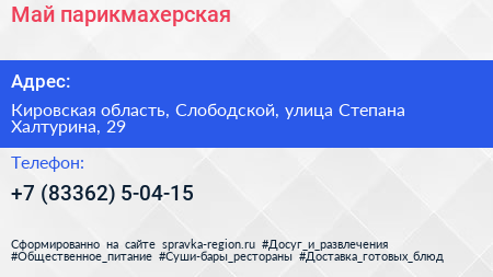 Май, парикмахерская по адресу Кировская область, Слободской, улица Степана Халтурина, 29 в дальнейшем Организация, размещена в следующих категориях: