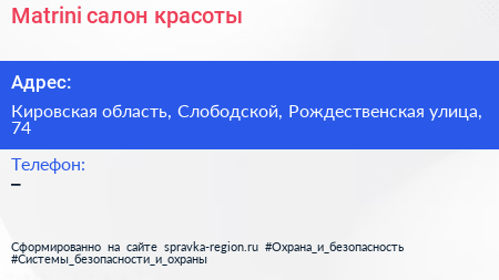 Matrini, салон красоты по адресу Кировская область, Слободской, Рождественская улица, 74 в дальнейшем Организация, размещена в следующих категориях: