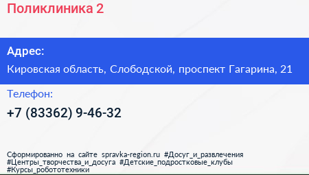 Поликлиника №2 по адресу Кировская область, Слободской, проспект Гагарина, 21 в дальнейшем Организация, размещена в следующих категориях: