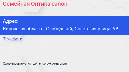 Семейная Оптика, салон по адресу Кировская область, Слободской, Советская улица, 99 в дальнейшем Организация, размещена в следующих категориях: