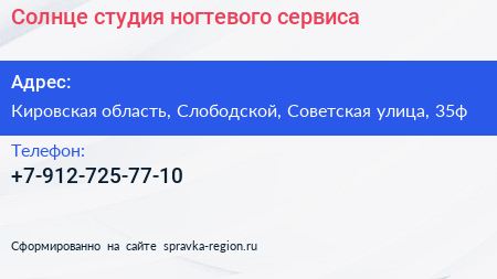 Солнце, студия ногтевого сервиса по адресу Кировская область, Слободской, Советская улица, 35ф в дальнейшем Организация, размещена в следующих категориях: