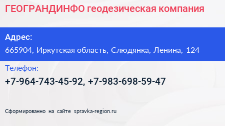ГЕОГРАНДИНФО, геодезическая компания по адресу 665904, Иркутская область, Слюдянка, Ленина, 124 в дальнейшем Организация, размещена в следующих категориях: