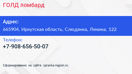 ГОЛД, ломбард по адресу 665904, Иркутская область, Слюдянка, Ленина, 122 в дальнейшем Организация, размещена в следующих категориях: