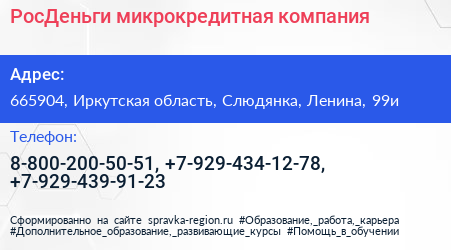 РосДеньги, микрокредитная компания по адресу 665904, Иркутская область, Слюдянка, Ленина, 99и в дальнейшем Организация, размещена в следующих категориях: