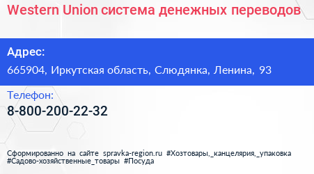 Western Union, система денежных переводов по адресу 665904, Иркутская область, Слюдянка, Ленина, 93 в дальнейшем Организация, размещена в следующих категориях: