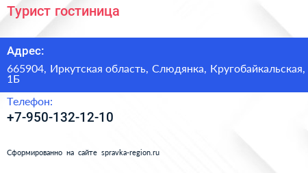 Турист, гостиница по адресу 665904, Иркутская область, Слюдянка, Кругобайкальская, 1Б в дальнейшем Организация, размещена в следующих категориях: