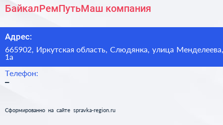 БайкалРемПутьМаш, компания по адресу 665902, Иркутская область, Слюдянка, улица Менделеева, 1а в дальнейшем Организация, размещена в следующих категориях: