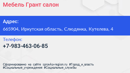 Мебель Грант, салон по адресу 665904, Иркутская область, Слюдянка, Кутелева, 4 в дальнейшем Организация, размещена в следующих категориях: