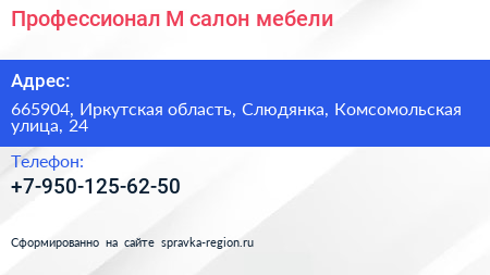 Профессионал М, салон мебели по адресу 665904, Иркутская область, Слюдянка, Комсомольская улица, 24 в дальнейшем Организация, размещена в следующих категориях: