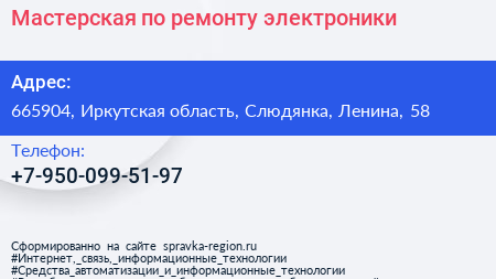 Мастерская по ремонту электроники по адресу 665904, Иркутская область, Слюдянка, Ленина, 58 в дальнейшем Организация, размещена в следующих категориях: