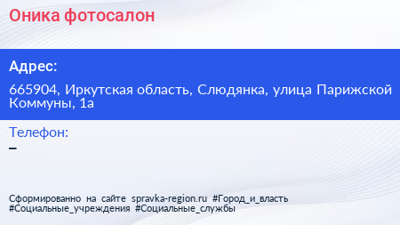 Оника, фотосалон по адресу 665904, Иркутская область, Слюдянка, улица Парижской Коммуны, 1а в дальнейшем Организация, размещена в следующих категориях: