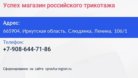 Успех, магазин российского трикотажа по адресу 665904, Иркутская область, Слюдянка, Ленина, 106/1 в дальнейшем Организация, размещена в следующих категориях: