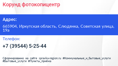 Корунд, фотокопицентр по адресу 665904, Иркутская область, Слюдянка, Советская улица, 19а в дальнейшем Организация, размещена в следующих категориях: