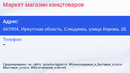 Маркет, магазин канцтоваров по адресу 665904, Иркутская область, Слюдянка, улица Кирова, 2Б в дальнейшем Организация, размещена в следующих категориях: