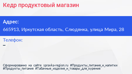 Кедр, продуктовый магазин по адресу 665913, Иркутская область, Слюдянка, улица Мира, 28 в дальнейшем Организация, размещена в следующих категориях: