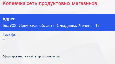 Копеечка, сеть продуктовых магазинов по адресу 665902, Иркутская область, Слюдянка, Ленина, 1в в дальнейшем Организация, размещена в следующих категориях:
