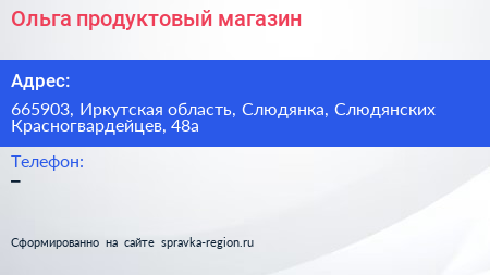 Ольга, продуктовый магазин по адресу 665903, Иркутская область, Слюдянка, Слюдянских Красногвардейцев, 48а в дальнейшем Организация, размещена в следующих категориях: