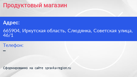 Продуктовый магазин по адресу 665904, Иркутская область, Слюдянка, Советская улица, 46/1 в дальнейшем Организация, размещена в следующих категориях: