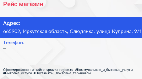 Рейс, магазин по адресу 665902, Иркутская область, Слюдянка, улица Куприна, 9/1 в дальнейшем Организация, размещена в следующих категориях: