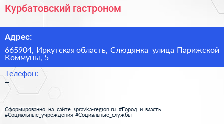 Курбатовский, гастроном по адресу 665904, Иркутская область, Слюдянка, улица Парижской Коммуны, 5 в дальнейшем Организация, размещена в следующих категориях: