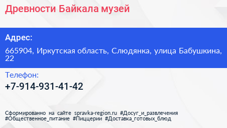 Древности Байкала, музей по адресу 665904, Иркутская область, Слюдянка, улица Бабушкина, 22 в дальнейшем Организация, размещена в следующих категориях: